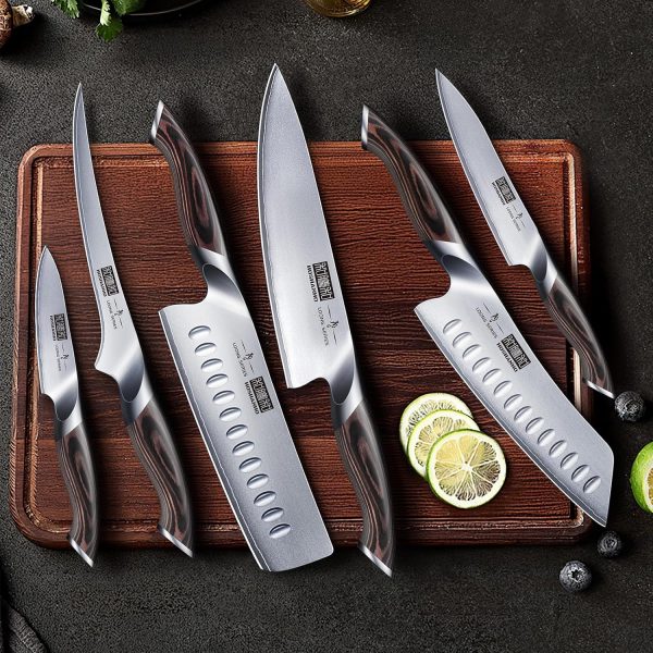 - 【Natural Pakkawood Handle】Handle of chef knife set for kitchen is made of high-hardness Pakkawood, undergone multiple layers of reinforcement treatment to ensure that it will not deform after long-term use. Handle design fits the natural grip of the hand, allowing for stable and comfortable slicing and dicing.