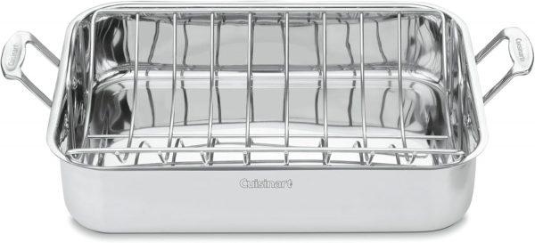 - EXCEPTIONAL DESIGN: The Cuisinart 16-inch rectangular roaster is made with a high-performance stainless steel exterior and riveted stainless steel handles. The steel rack is large enough to handle a big Thanksgiving turkey and perfect for slow-roasting root vegetables